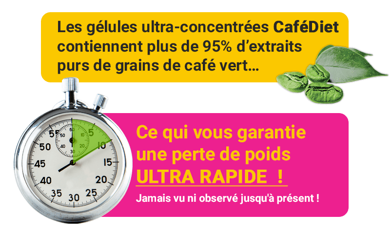 Les gélules ultra concentrées CaféDiet contiennent plus de 95% d’extrait pur et frais de café vert. Cequi vous garantie le dosage parfait pour perdre ultra-rapidement, et sansfaire le moindre effort, tous vos kilos en trop.
